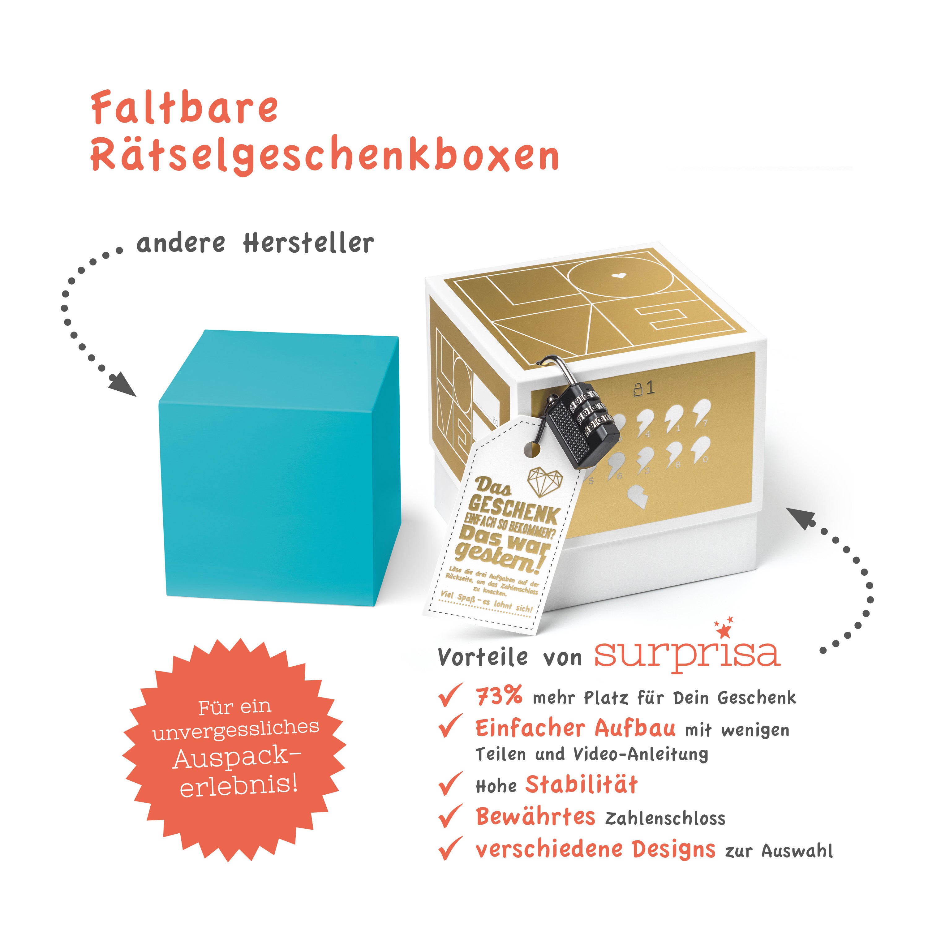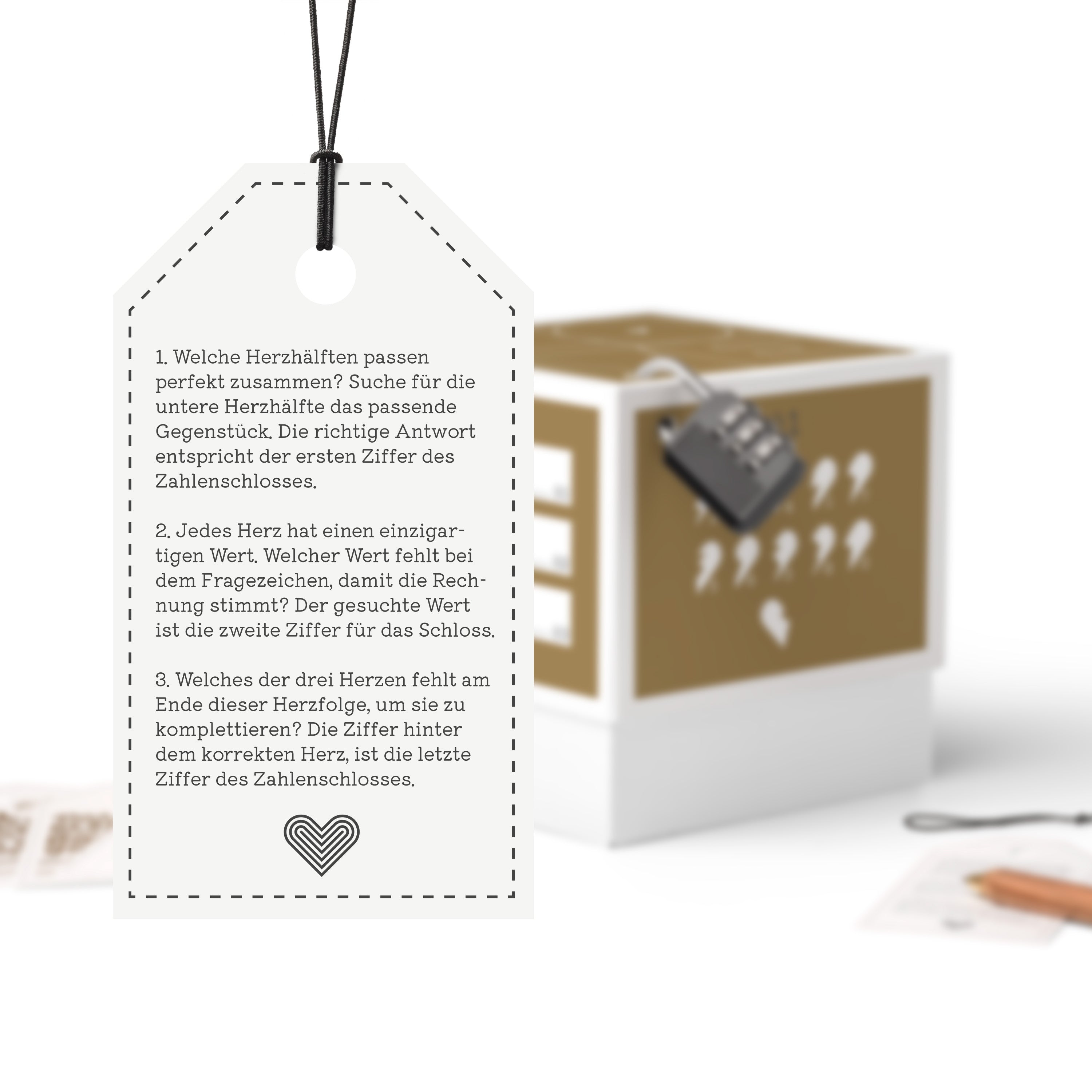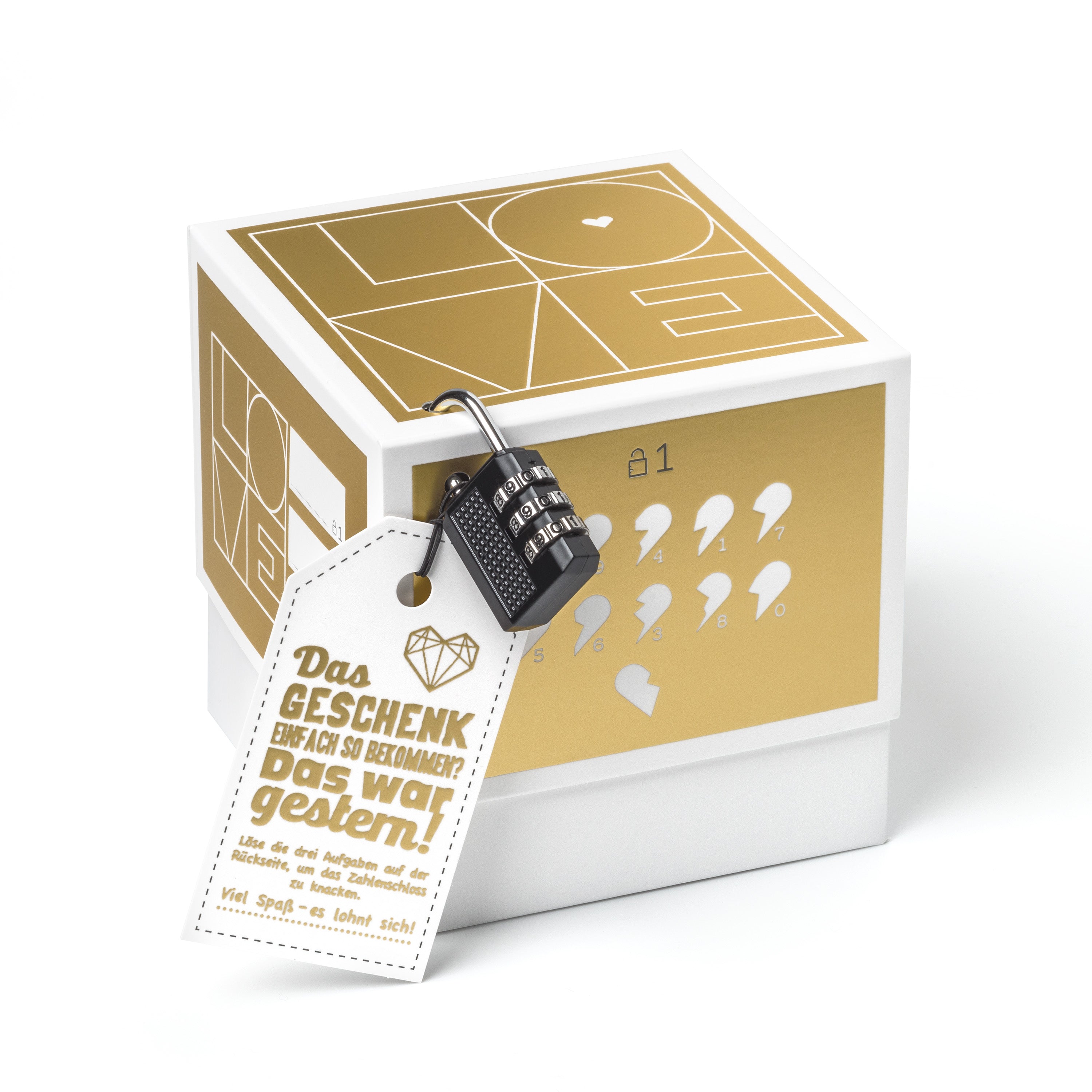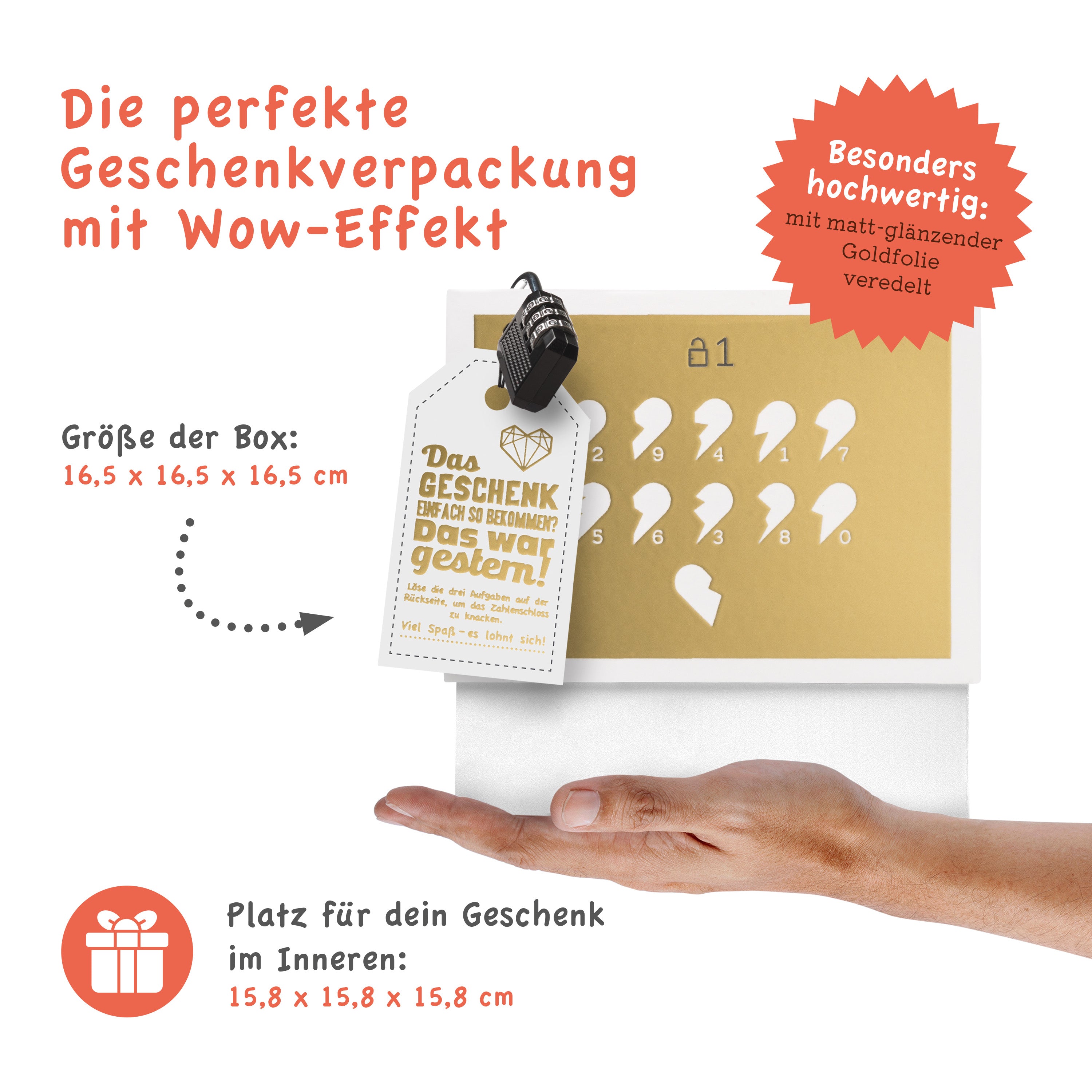 - 1x veredelte Geschenkbox mit Goldfolie und Liebesrätseln (wahlweise 12,5 x 12,5 x 12,5 cm oder 16,5 x 16,5 x 16,5 cm)