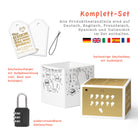 ...und das wortwörtlich: Im Inneren der Knobelbox kannst Du nämlich Dein Geldgeschenk zur Hochzeit oder andere Geschenke einschließen, die Du überreichen möchtest. Ob Geldschein, Gutscheine, Erlebnisgeschenke oder auch Pralinen, Parfum für die Freundin, Tickets, Gürtel, Schmuck oder kleine textile oder technische Geschenke für den Freund. Diese Box ist speziell für ein Geldgeschenk zur Hochzeit konzipiert und macht den Moment des Überreichens noch besonderer. Ein Geldgeschenk Hochzeit in dieser Box wird unvergesslich sein. Damit der Beschenkte es jedoch bekommt, muss erst das Zahlenschloss geknackt werden, indem drei Aufgaben auf der Box gelöst werden. Jede Aufgabe führt jeweils zu einer Ziffer des Schlosses. Ein Geldgeschenk Hochzeit wird so zu einer spannenden Herausforderung. Diese Box ist perfekt, um ein Geldgeschenk Hochzeit auf einzigartige Weise zu präsentieren. Oder Du nutzt den Blanko-Geschenkanhänger, um selbst Aufgaben zu formulieren und gestaltest damit ganz einfach Dein personalisiertes Geschenk. Außerdem gibt es auf dem Unterteil Platz für Deinen individuellen Text und Bilder. So hast Du alles in Einem: eine hochwertige Geschenkverpackung mit Überraschungseffekt, die jedes Geldgeschenk zur Hochzeit persönlich und kreativ macht. Diese einzigartige Box ist perfekt, um ein Geldgeschenk zur Hochzeit auf originelle Weise zu überreichen. Ein Geldgeschenk zur Hochzeit wird mit dieser Box zu einem echten Highlight. Für alle, die ein Exit Game oder Escape Boxen lieben!