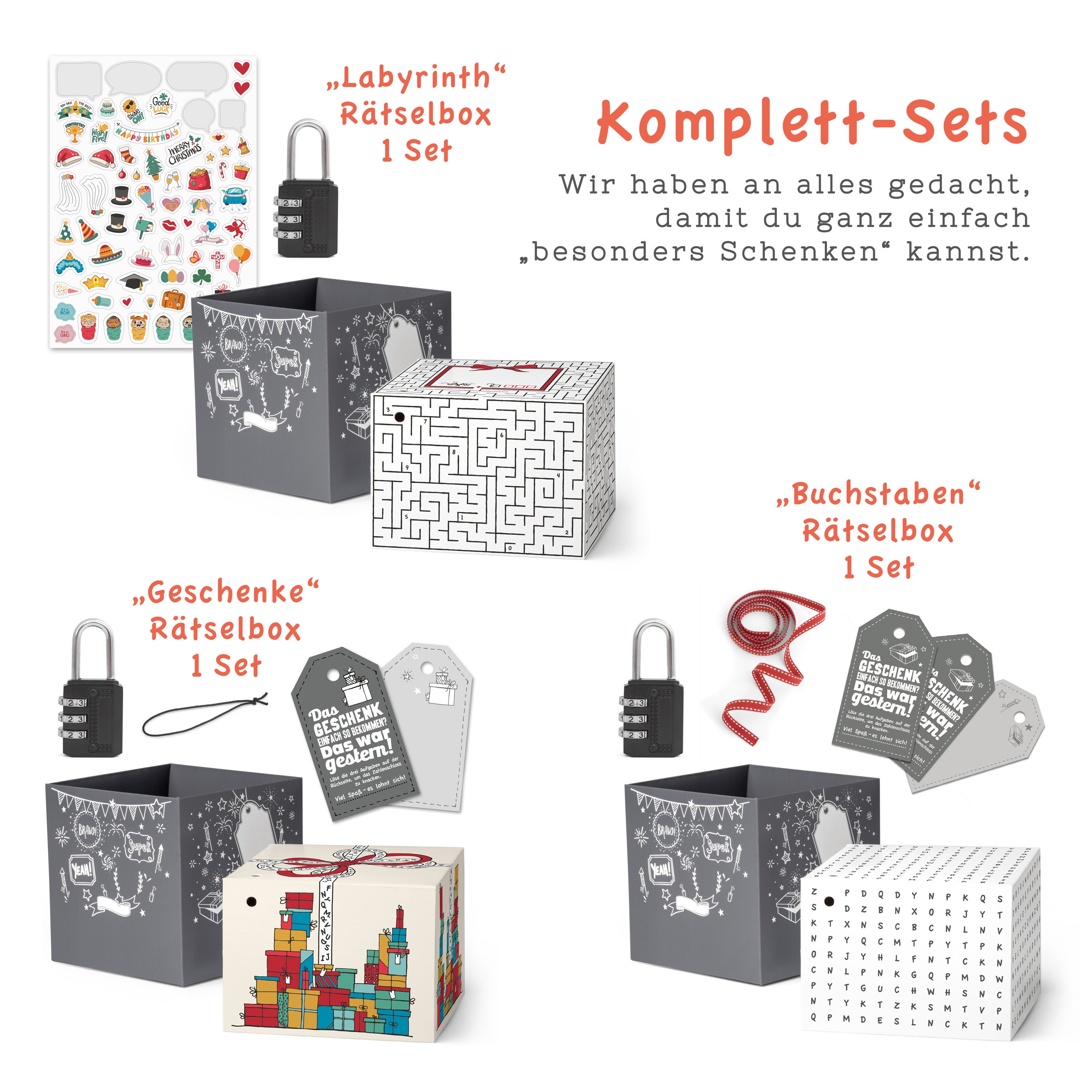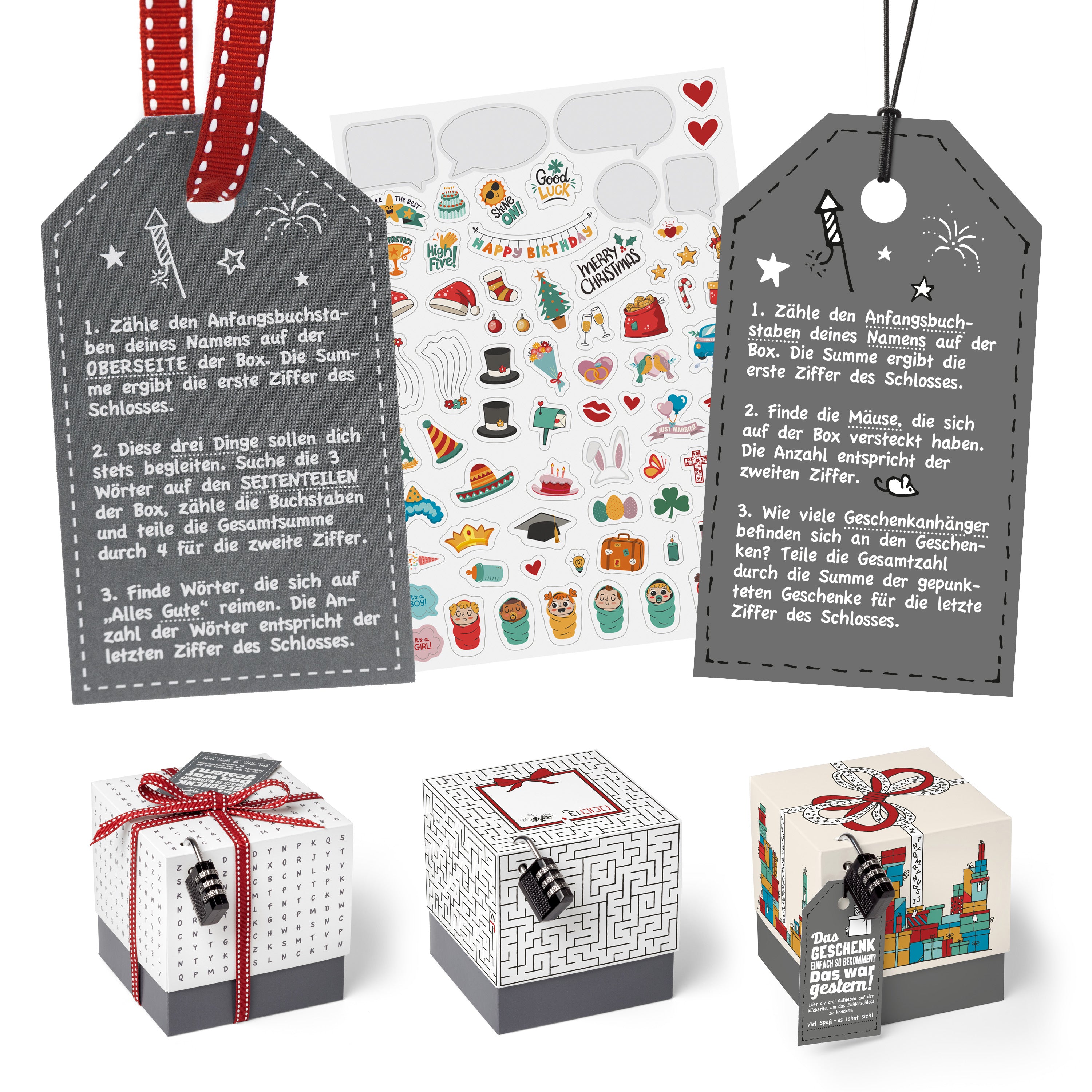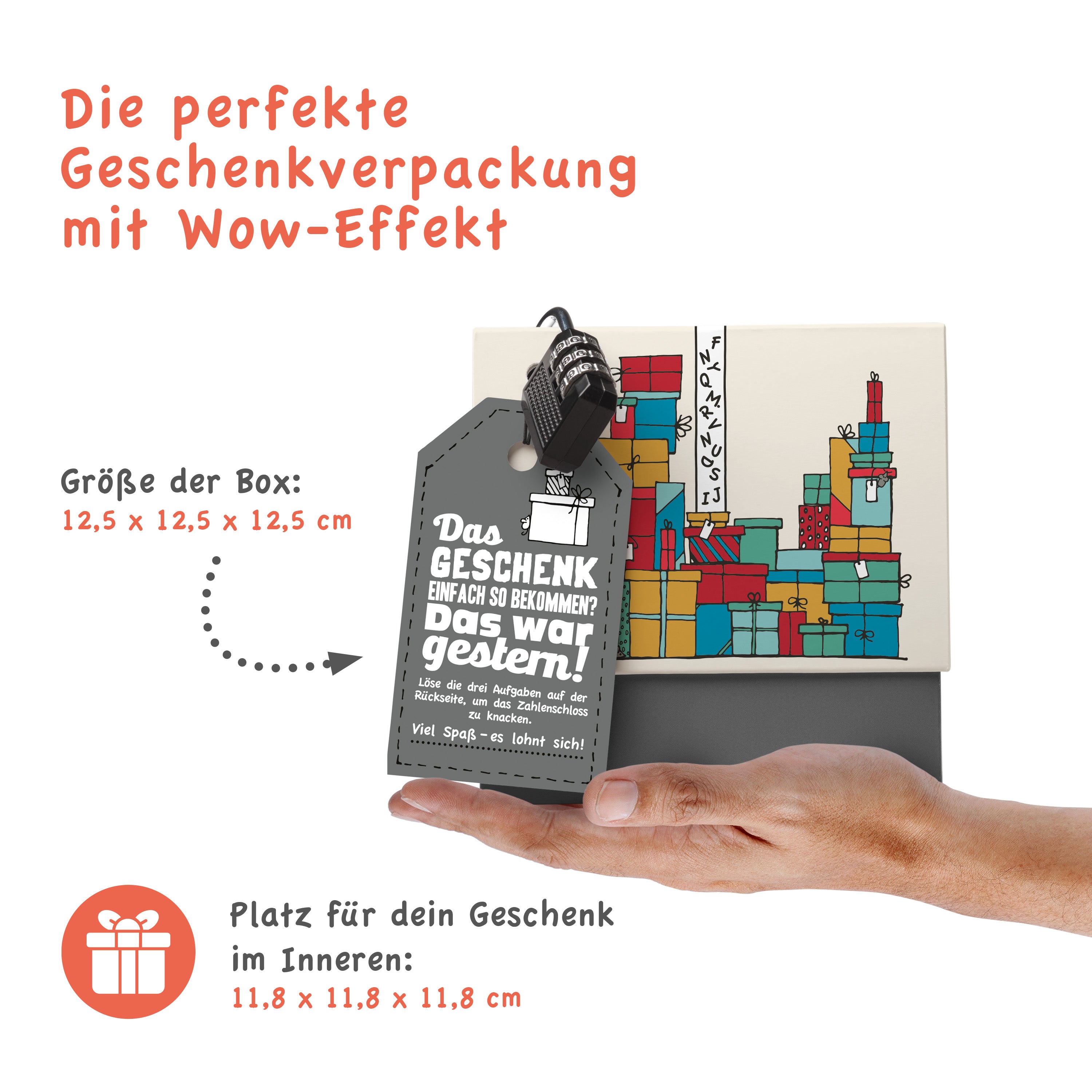 ...und das wort-wörtlich: im Inneren der Knobelbox kannst Du nämlich Dein Geschenk einschließen, das Du überreichen möchtest. Ob Geldschein, Gutscheine, Erlebnisgeschenke oder auch Pralinen oder Parfum für die Freundin, Tickets, Gürtel, Schmuck oder kleine textile oder technische Geschenke für den Freund. Damit der Beschenkte es jedoch bekommt, muss er erst das Zahlenschloss knacken, wozu Wörter auf der Box gesucht und gefunden werden müssen. Drei Aufgaben führen jeweils zu einer Ziffer des Schlosses. Oder Du nutzt den Blanko-Geschenkanhänger, um selbst Aufgaben zu formulieren, und gestaltest damit ganz einfach Dein personalisiertes Geschenk. Außerdem gibt es auf dem Unterteil Platz für Deinen individuellen Text und Bilder. So hast Du alles in Einem: eine hochwertige Geschenkverpackung mit Überraschungseffekt, die jedes Geschenk persönlich und kreativ macht. Für alle, die ein Exit Game oder Escape Boxen lieben!