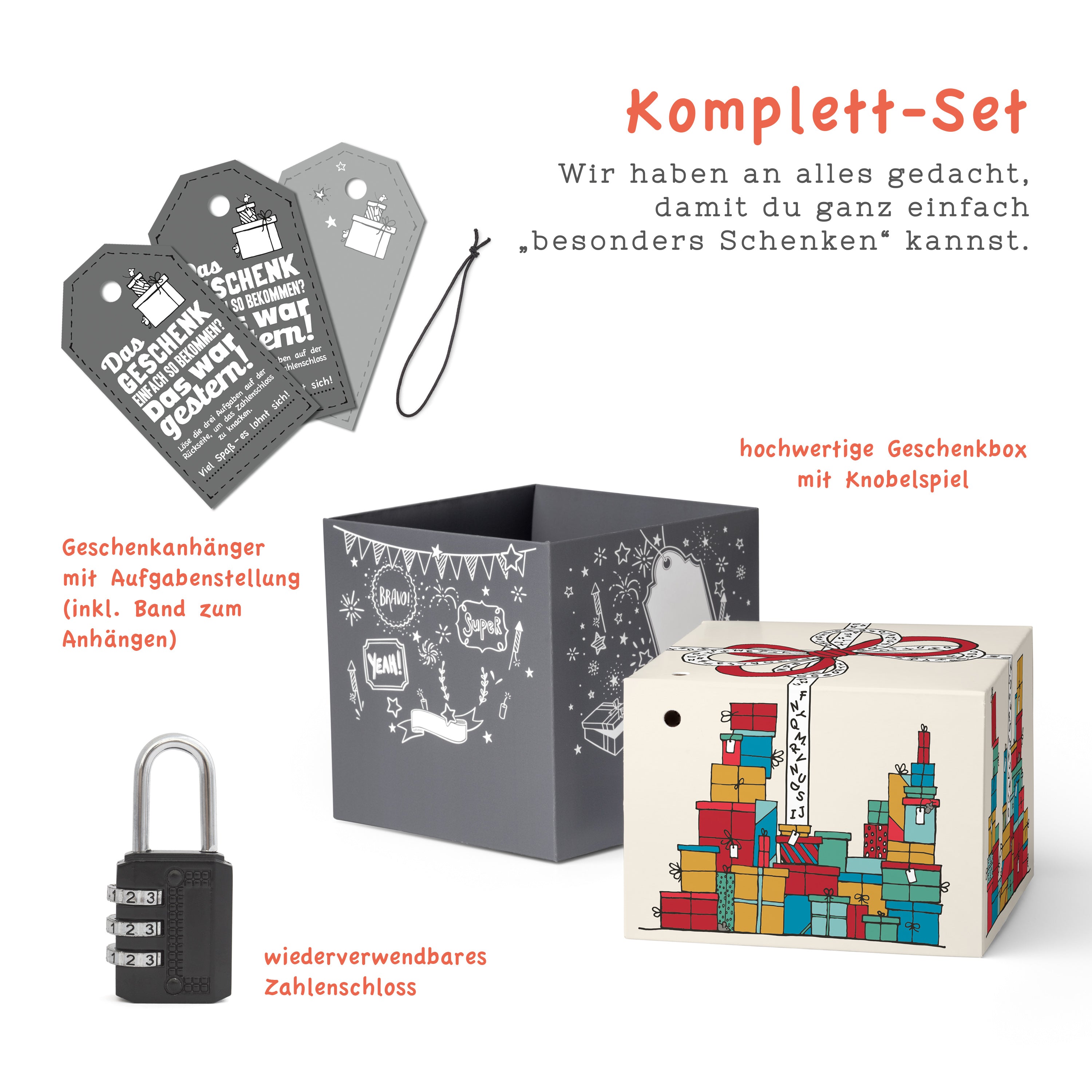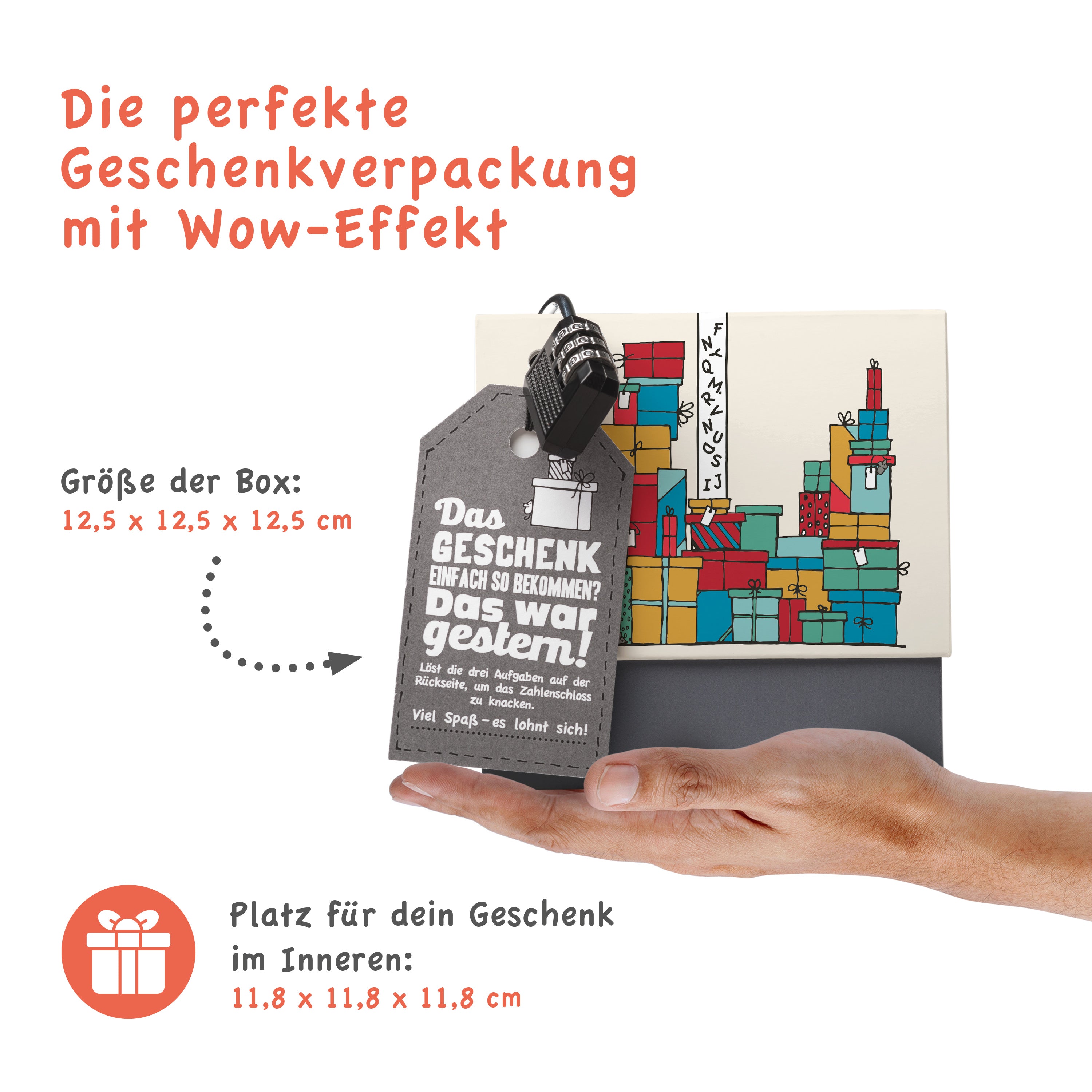 ...und das wort-wörtlich: im Inneren der Knobelbox kannst Du nämlich Dein Geschenk einschließen, das Du überreichen möchtest. Ob Geldschein, Gutscheine, Erlebnisgeschenke oder auch Pralinen oder Parfum für die Freundin, Tickets, Gürtel, Schmuck oder kleine textile oder technische Geschenke für den Freund. Damit der Beschenkte es jedoch bekommt, muss er erst das Zahlenschloss knacken, wozu verschiedene Dinge auf der Box gesucht und gefunden werden müssen. Drei Aufgaben führen jeweils zu einer Ziffer des Schlosses. Oder Du nutzt den Blanko-Geschenkanhänger, um selbst Aufgaben zu formulieren, und gestaltest damit ganz einfach Dein personalisiertes Geschenk. Außerdem gibt es auf dem Unterteil Platz für Deinen individuellen Text und Bilder. So hast Du alles in Einem: eine hochwertige Geschenkverpackung mit Überraschungseffekt, die jedes Geschenk persönlich und kreativ macht. Für alle, die ein Exit Game oder Escape Boxen lieben!