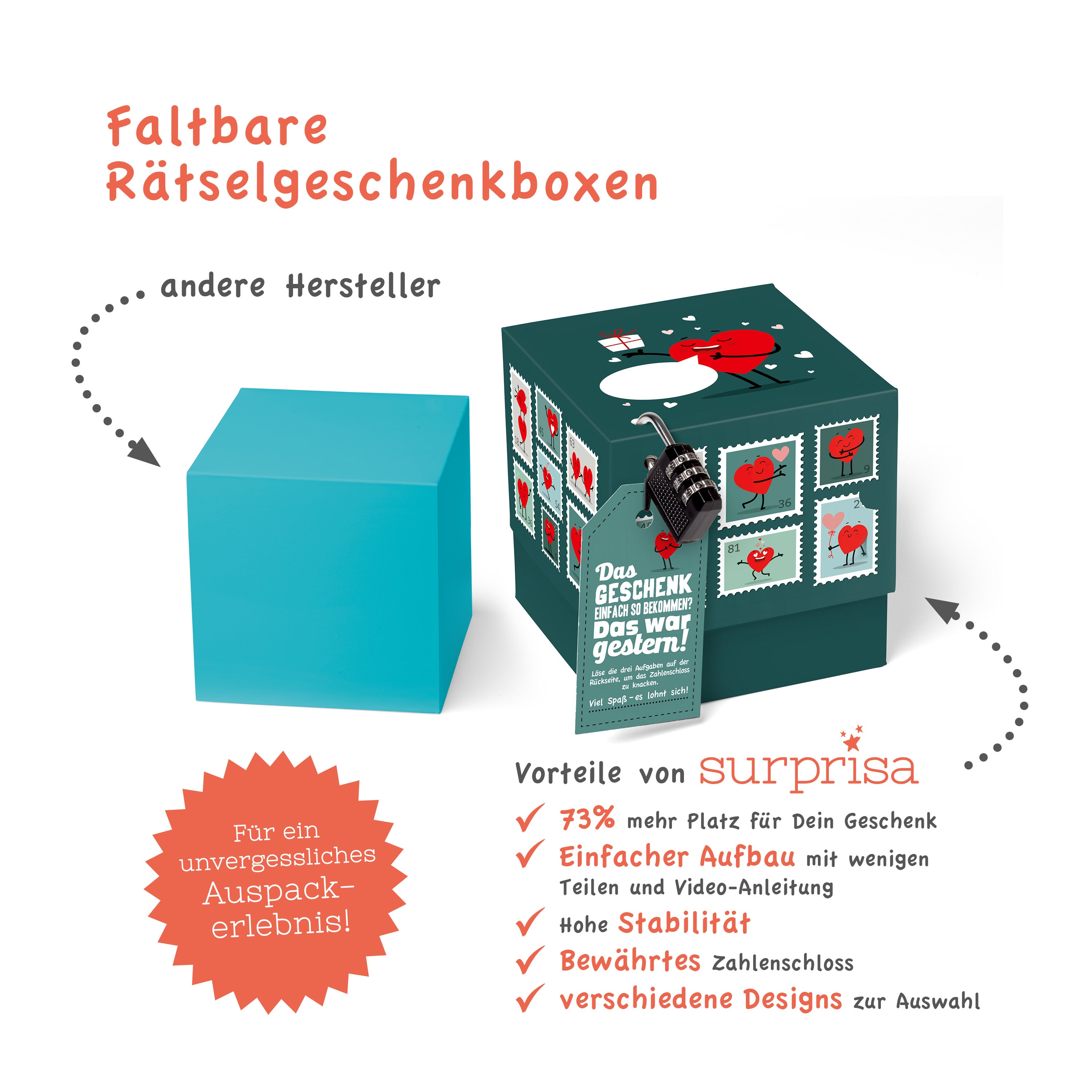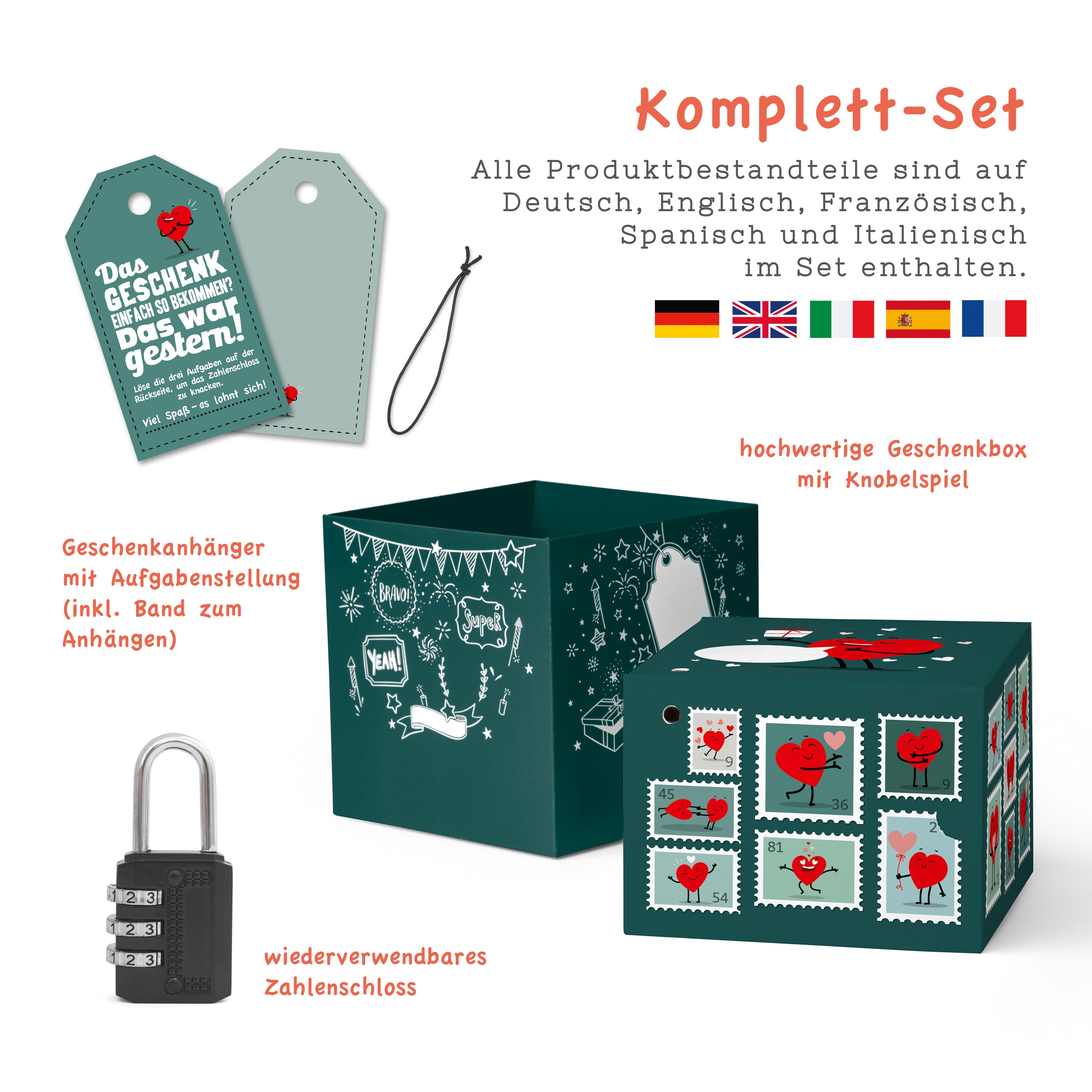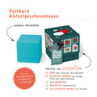 - 1x Geschenkbox in petrol mit Briefmarkenrätsel, 12,5 x 12,5 x 12,5 cm (außen), 11,8 x 11,8 x 11,8 cm (innen)