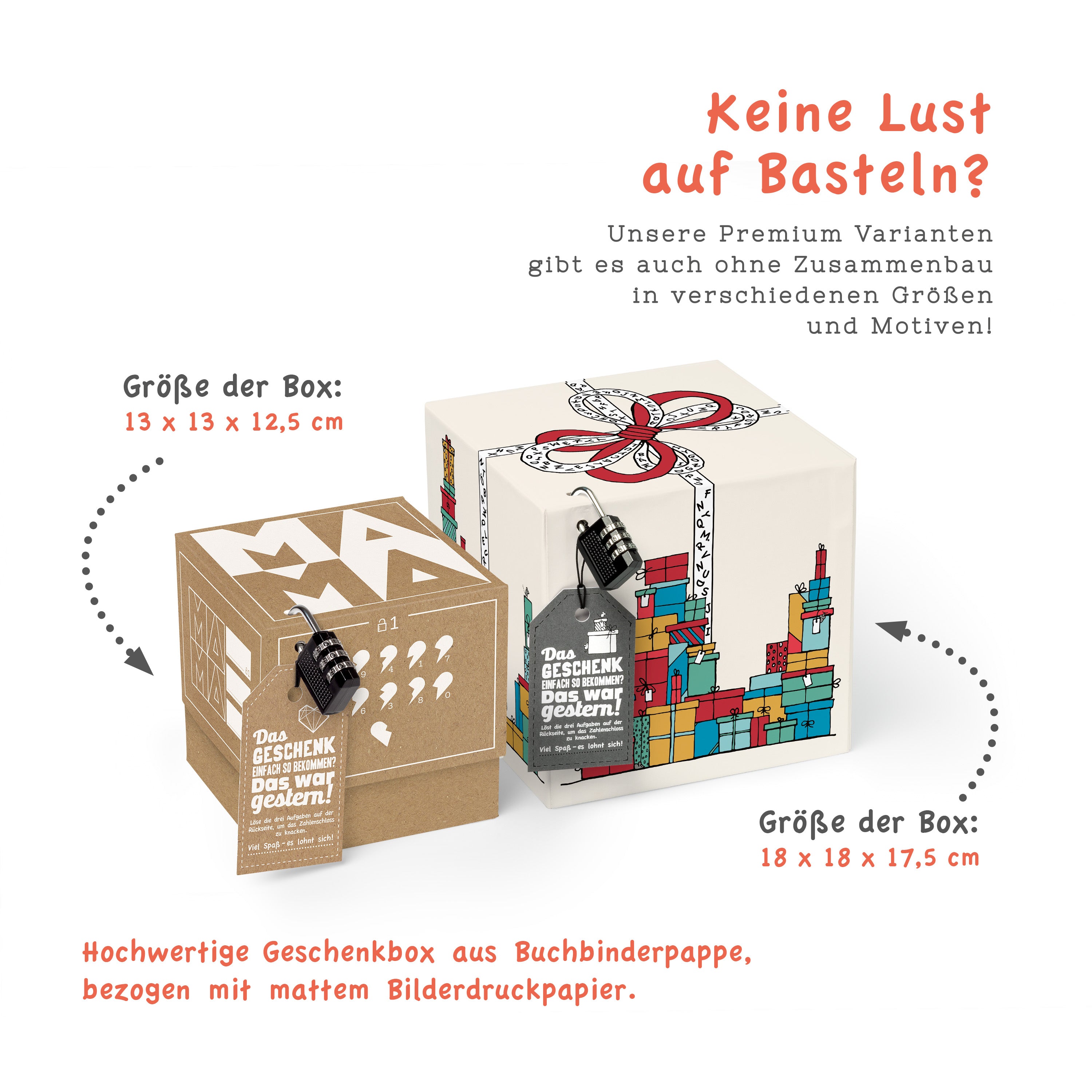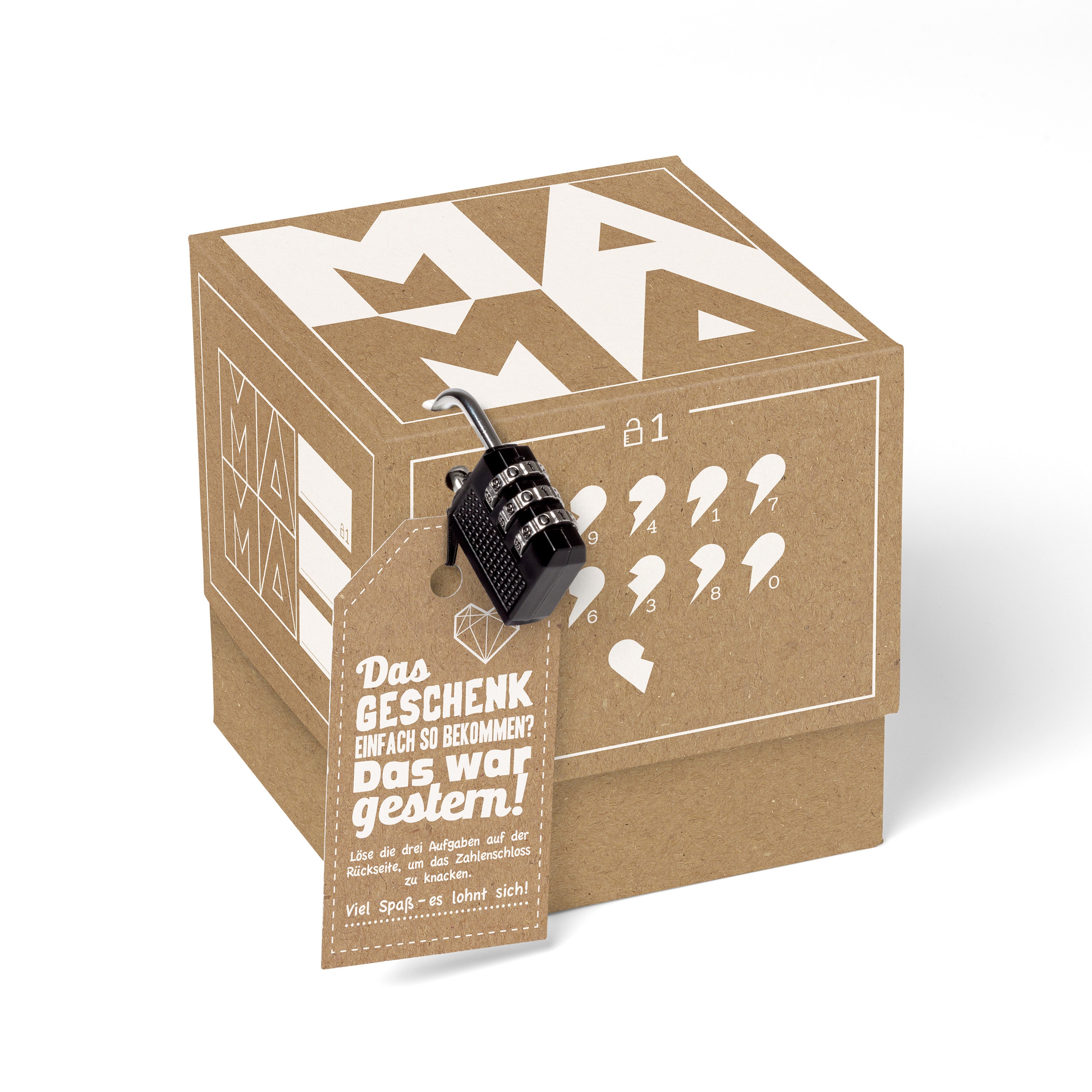 - 1x Geschenkbox MAMA aus Kraftpapier mit Rätseln, 12,5 x 12,5 x 12,5 cm (außen), 11,8 x 11,8 x 11,8 cm (innen)