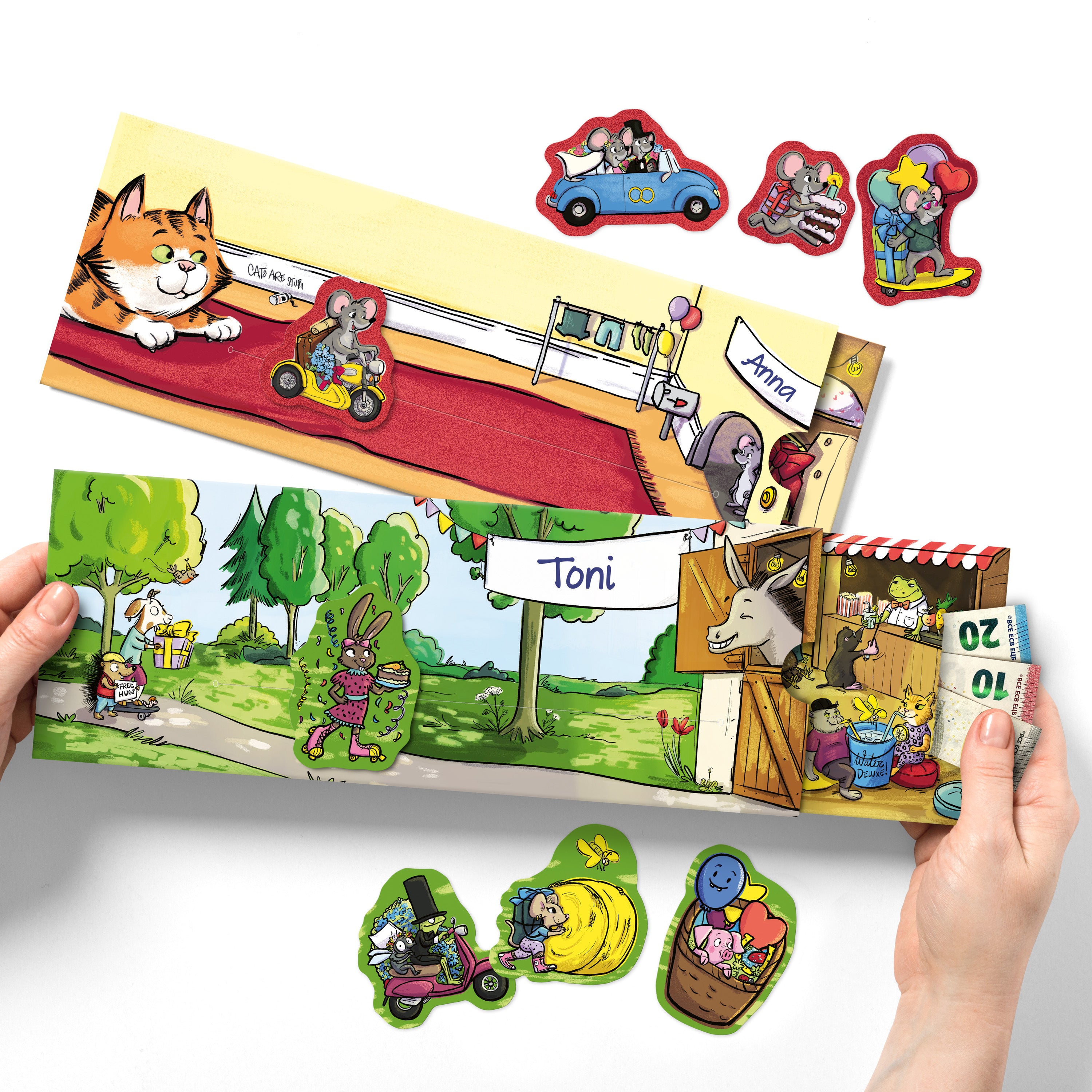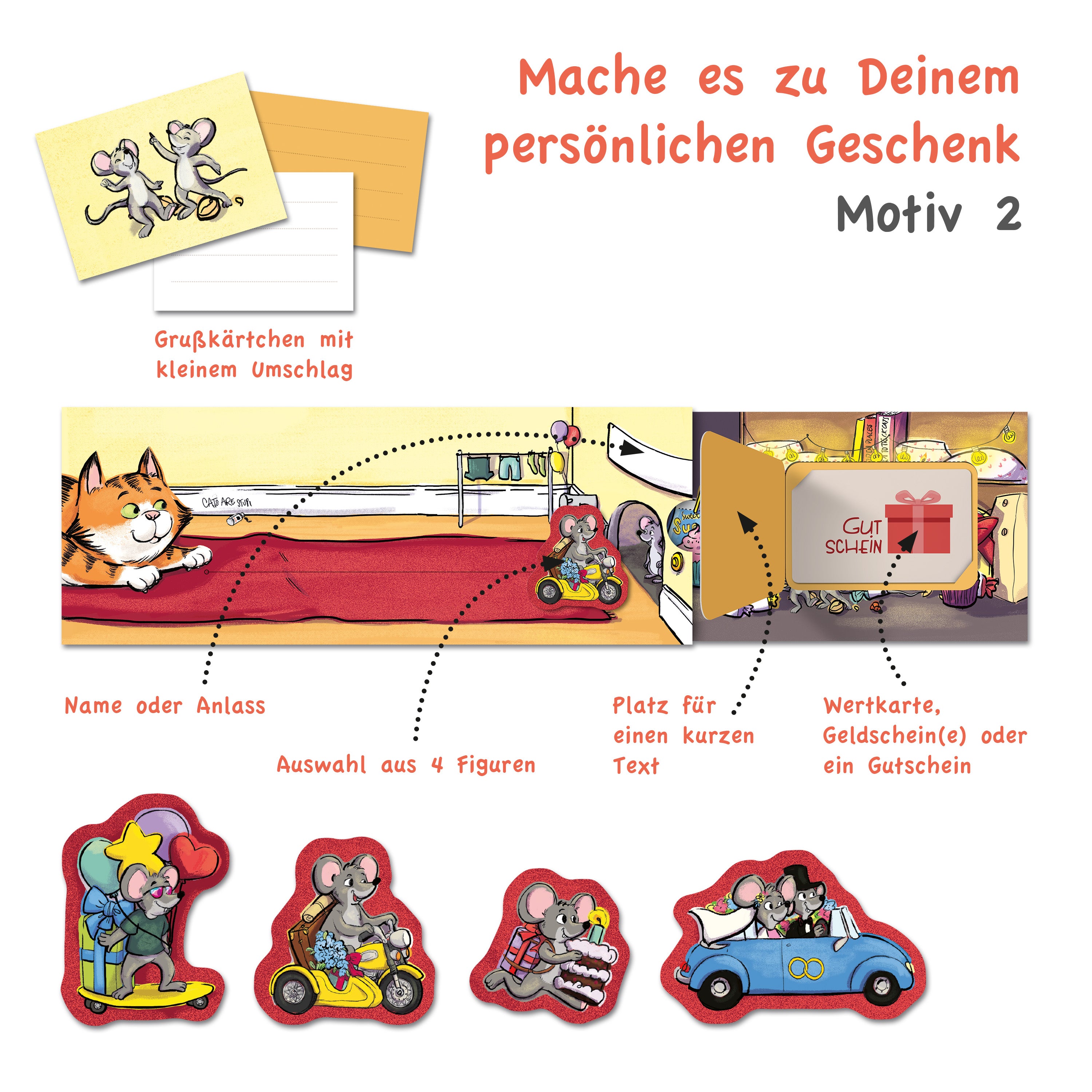 Unsere lebendigen Schiebekarten mit den Motiven „Katz & Maus“ und „Goldesel“ bieten die tolle Möglichkeit, Gutscheine und Geldgeschenke kreativ für jeden Anlass zu verpacken.