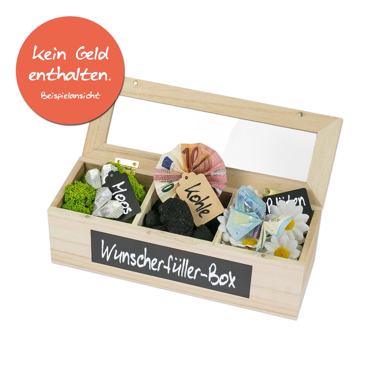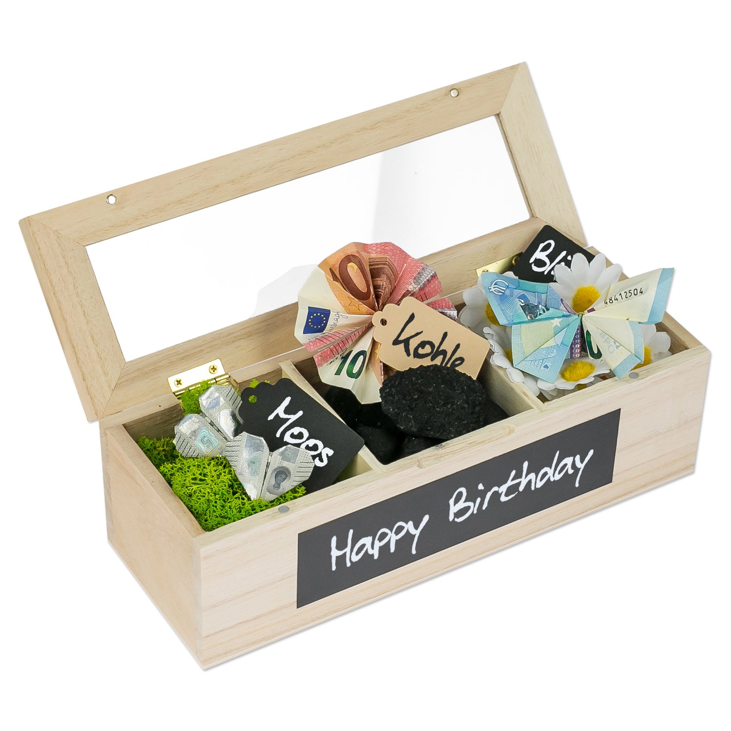 Die Geldscheine werden in einer Holzbox mit den drei Synonymen Moos, Kohle und Blüten verschenkt, die du mithilfe der beiliegenden Anhänger kennzeichnen kannst. Personalisiere dein Geschenk außerdem auf dem Tafelfolien-Feld vorne auf der Box und gib deinem Geschenk damit eine noch persönlichere Note. Die moderne Box lässt sich später für vielerlei Dinge weiterverwenden.