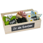 Kreative und lustige Geldgeschenkidee mit Moos, Blüten und Kohle. Alles in einer wunderschönen Holzbox mit Tafelkreidesticker zum individuellen Beschriften (ACHTUNG Kreide oder Kreidestift liegen nicht bei)
