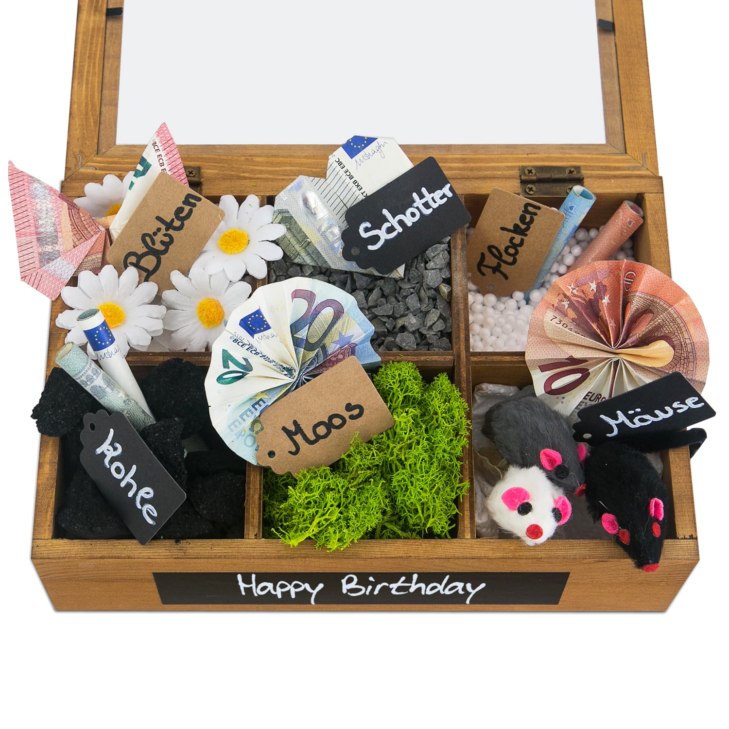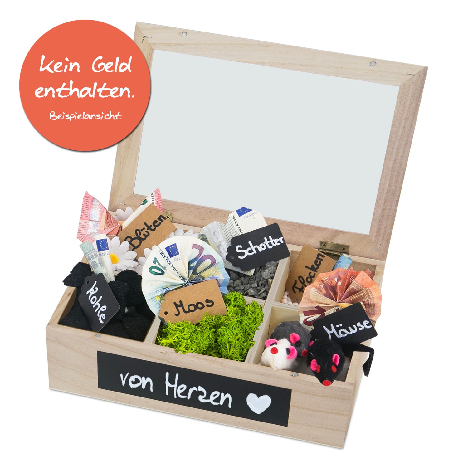 Suchst du eine kreative und lustige Verpackung für Geldgeschenke? Unsere Schotter Schatulle ist die perfekte Lösung! Diese einzigartige Verpackung für Geldgeschenke kommt mit Moos, Mäusen, Schotter, Kohle und mehr! Alles in einer wunderschönen Holzbox mit Tafelkreidesticker zum individuellen Beschriften (ACHTUNG Kreide oder Kreidestift liegen nicht bei).