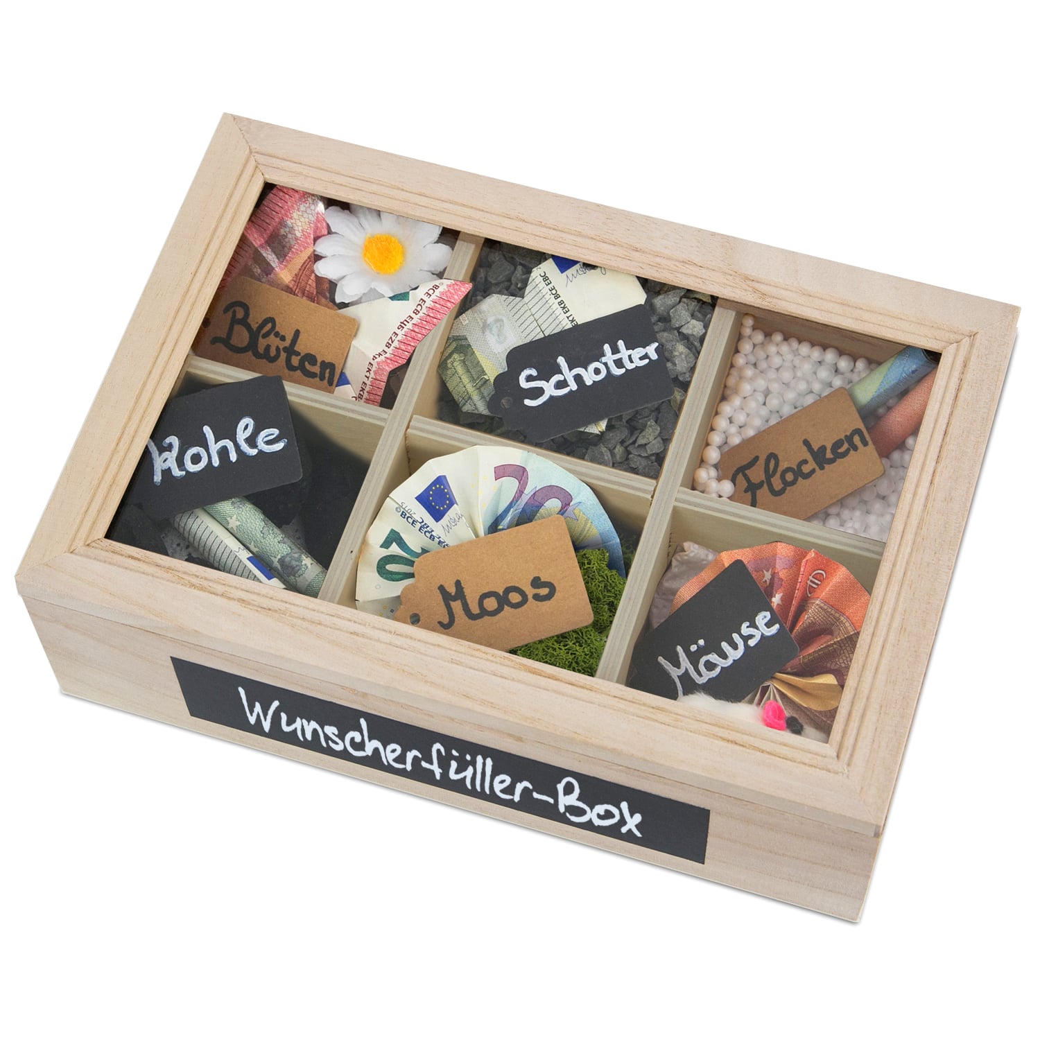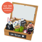 Die Idee der Schotter-Schatulle: Die Geldscheine werden in einer hochwertigen Holzbox mit sechs Synonymen für Geld (Moos, Kohle, Schotter, Mäuse, Flocken und Blüten) verpackt, die du mithilfe der beiliegenden Anhänger kennzeichnen kannst. Personalisiere dein Geschenk zusätzlich auf dem Tafelfolien-Feld vorne auf der Box und gib deinem Geschenk damit eine persönliche Note. Diese moderne Verpackung für Geldgeschenke kann später vielseitig weiterverwendet werden. Eine Verpackung für Geldgeschenke sollte nicht nur praktisch, sondern auch stilvoll sein. Mit dieser Verpackung für Geldgeschenke wird jedes Präsent zu einem Highlight. Diese kreative Verpackung für Geldgeschenke sorgt für Begeisterung bei jedem Anlass. Unsere Verpackung für Geldgeschenke ist perfekt für Geburtstage, Hochzeiten und andere besondere Anlässe. Sie bietet eine elegante und lustige Möglichkeit, Geld kreativ zu verschenken. Die Verpackung für Geldgeschenke von Surprisa ist auch eine tolle Dekoration für jeden Anlass. Unsere Verpackung für Geldgeschenke hebt sich durch ihre einzigartige Gestaltung ab.
