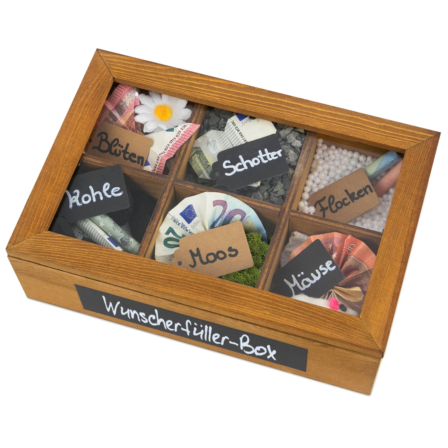 Dank des schicken Holzes in heller oder dunklerer Ausführung passt die Box zu rustikalen Landhaus-Hochzeiten ebenso wie zu modernen Loft-Partys. Der transparente Acryl-Deckel schützt den Inhalt, ohne die Sicht zu verdecken, und macht die Holz-Geldbox später zur praktischen Aufbewahrung für Schmuck, Tee oder Sammlerstücke. Wer mag, legt jedem Fach eine andere Banknoten-Stückelung bei – perfekt, um größere Beträge kreativ aufzuteilen.