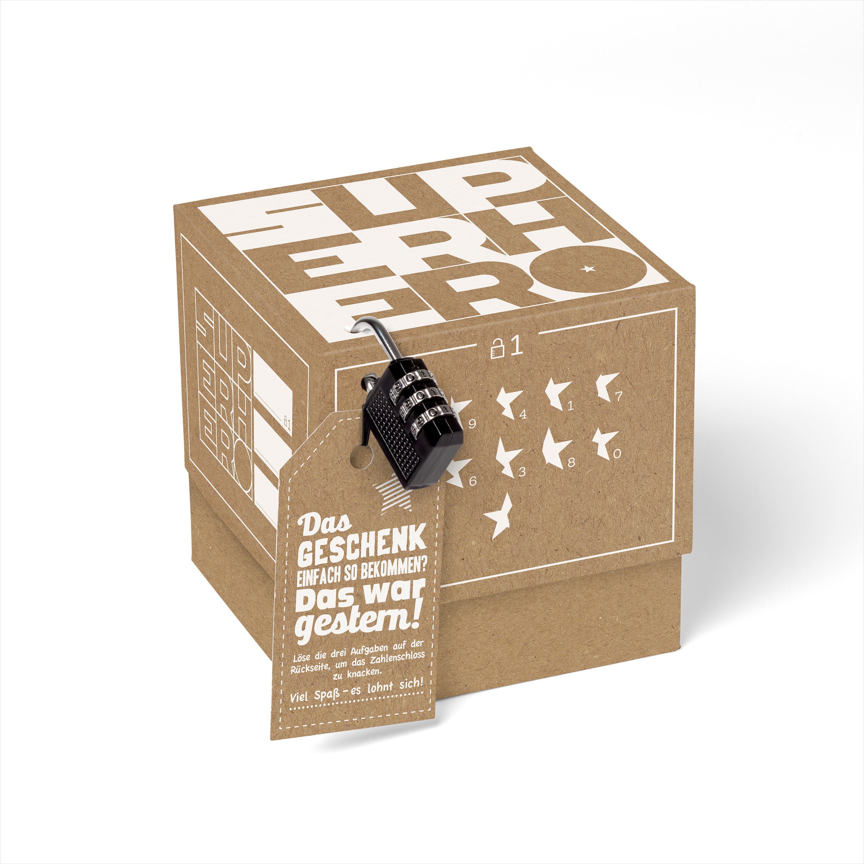 ...und das wortwörtlich: Schließe dein Geschenk im Inneren der Knobelbox ein – ob Gutscheine, Geld oder kleine Superhelden-Gadgets. Bevor die/der Beschenkte es jedoch erhält, müssen drei heldenhafte Rätsel gelöst werden, die zu den Ziffern des Zahlenschlosses führen. Mit dem Blanko-Geschenkanhänger kannst du eigene Superhelden-Aufgaben gestalten und so dein Geschenk personalisieren. Diese hochwertige Geschenkbox ist perfekt für alle, die von Superhelden nicht genug bekommen und für jede Überraschung bereit sind!