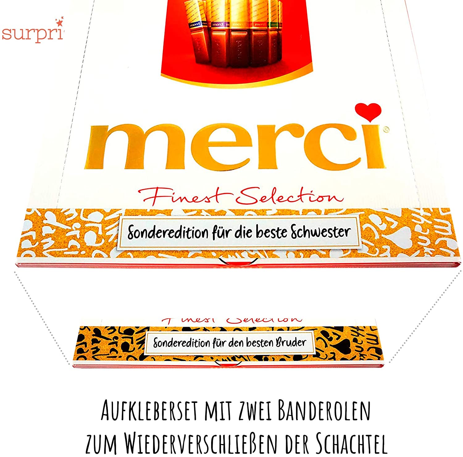 Aufkleberset für Merci-Schokolade: Süße Grüße für Deine Schwester oder Deinen Bruder!