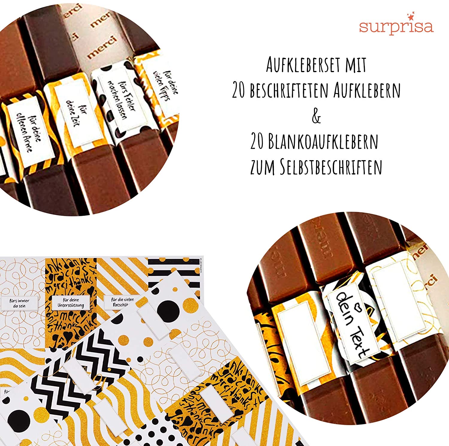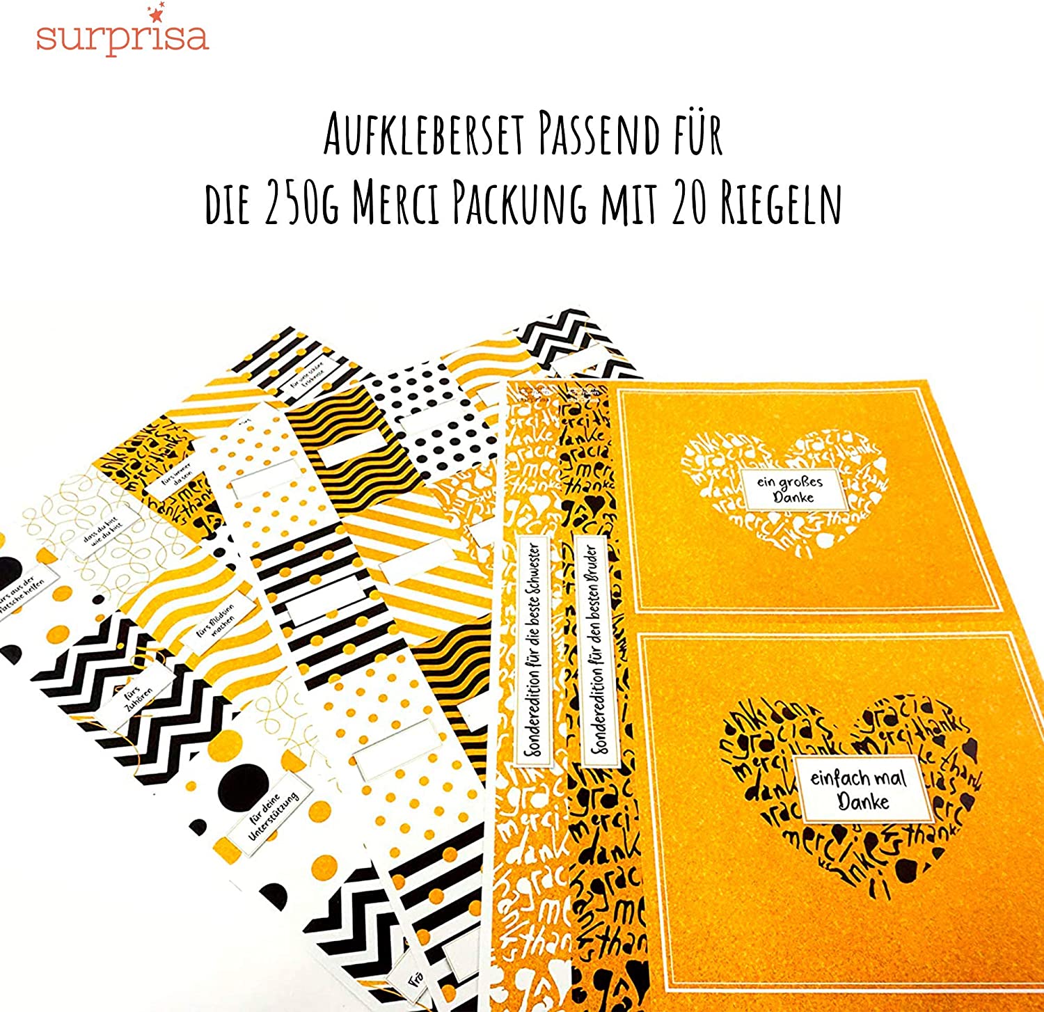 Manchmal möchte man einfach mal Danke sagen und womit geht das besser, als mit einer Packung Merci-Schokolade? Mit unseren Aufkleber-Sets wird es jetzt noch persönlicher durch die kleinen Botschaften auf jedem einzelnen Riegel. Wer es noch individueller mag schreibt einfach eigene Texte auf die 20 Blanko-Aufkleber, die jedem Set beiliegen. Das perfekte Geschenk für einen kreativen und sehr persönlichen Gruß zum Geburtstag, um Danke zu sagen oder einfach für eine Aufmerksamkeit Zwischendurch. Zaubere einem lieben Menschen ganz einfach ein Lächeln ins Gesicht. Das Aufkleberset ist für die 250g-Merci Packung gedacht und enthält sowohl 20 Sticker mit Textvorschlägen sowie 20 Blanko-Aufkleber zum Selbstbeschriften.
